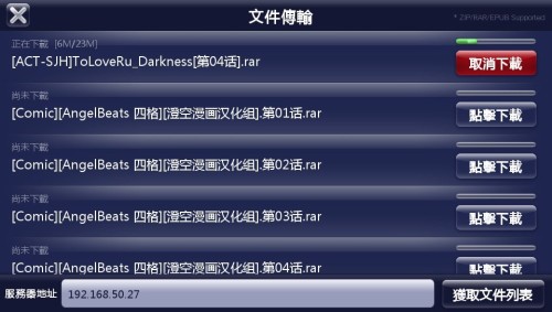 2)把窗口中輸入框上顯示的“http://192.168.*.*/”記住,然后進入ComicGo,點擊“”進入傳輸界面,輸入剛剛的ip地址后點擊“獲取文件列表"按鈕,就可以看到剛才拖進去的漫畫啦!