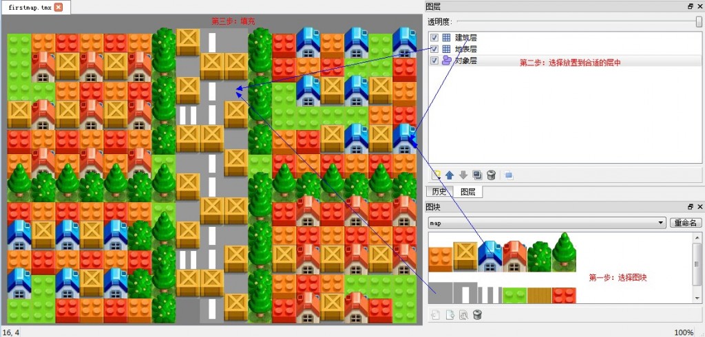 第三步:創建層,我這里創建了三個層...你也可以不創建,就使用默認那個層,然后將圖塊區域中的圖塊去填充你左邊的地圖..