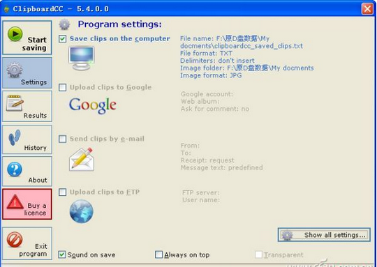 1.文字存檔 在ClipboardCC主窗口左側點擊“Settings”按鈕,在窗口右下角點擊“Show all settings”按鈕,在設置窗口(如圖1)左側點擊“Files”按鈕,在右側窗口中的“Format”列表中選擇文件存儲類型(包括TXT,RTF,HTML等,默認為文本格式)。在“File to save text”欄中選擇對應類型文件存儲路徑。因為復制的數據可能帶有格式屬性,因此小張選擇了RTF格式。為了管理上的便捷,勾選可“Merg text and image into one file”項,可以將復制的文本和圖片全部保存在目標RTF文件中。為了便于區分不同的的數據,勾選“Insert delimiter between text clips”項,表示不同的存儲內容之間添加分隔標記。分別點擊上下“Change”按鈕,可以自定義數據塊前后分隔標記。