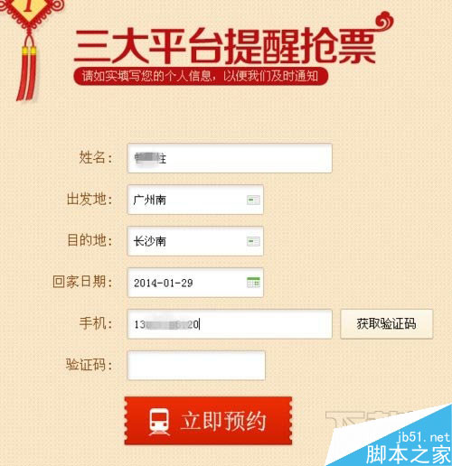 找到填寫預約信息的地方,填上你的姓名,出發地,目的地,回家日期,手機號碼,點獲取驗證碼,如果收不到驗證碼,可以多試幾次。如下圖