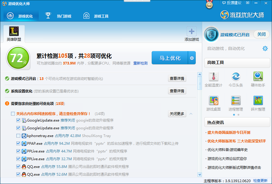 以上就是游戲優(yōu)化大師高級工具的種種妙用,為了更好的游戲體驗,玩家們在使用一鍵優(yōu)化的同時記得根據(jù)自己的需求打開小工具,今天先介紹到這~預(yù)知后事如何,請看下回分解。