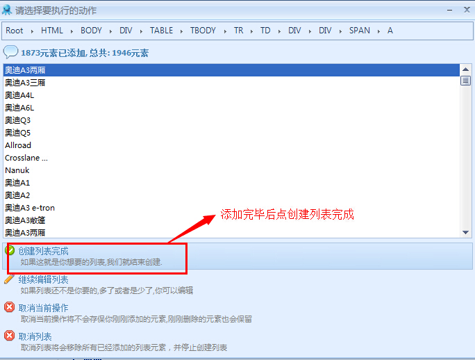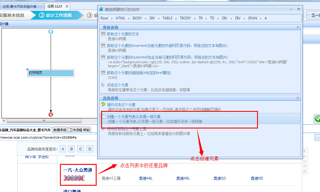 第三步,點(diǎn)擊要采集的頁面元素,比如說奧迪S7,系統(tǒng)彈出對(duì)話框后,選擇創(chuàng)建一個(gè)元素列表處理一個(gè)元素