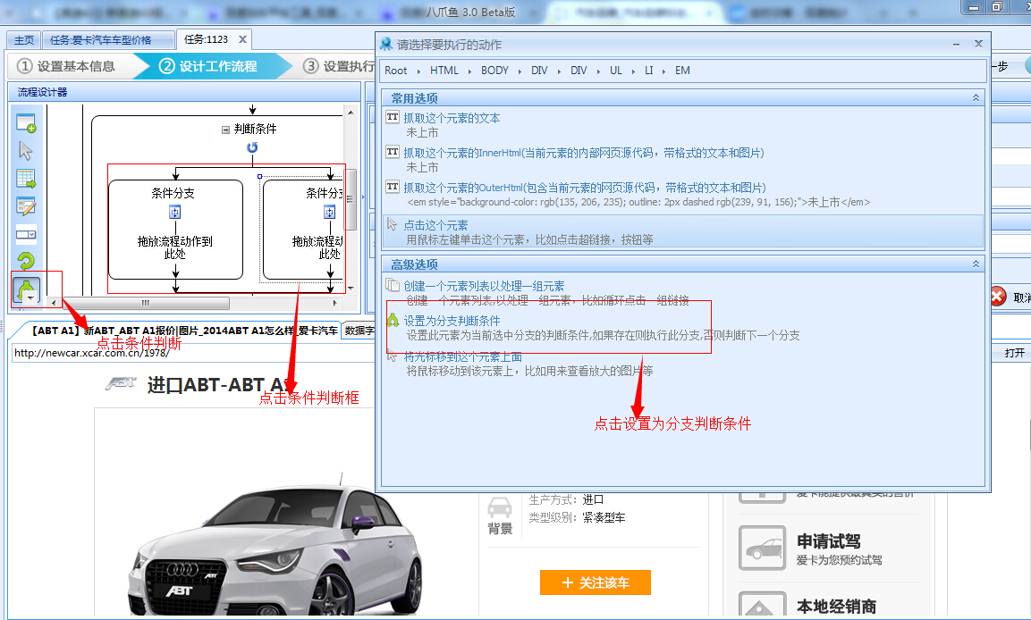 第六步,由于愛卡網(wǎng)的品牌列表中有部分未上市的,無法采集到價(jià)格,我們可以在此以是否有市場(chǎng)價(jià)作為一個(gè)判斷條件。設(shè)置一個(gè)條件判斷項(xiàng)