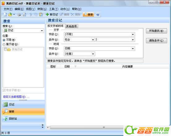 效能日記本提供搜索功能,允許用戶通過文本內容搜索已有數(shù)據(jù),同時,程序也提供了按分組、按時間(如記錄的創(chuàng)建時間和更改時間)來搜索記錄的服務。用戶只需單擊工具欄的“搜索”按鈕即可轉到搜索功能模塊。一般情況下,用戶只需在搜索內容文本框中輸入要搜索的文字,然后按下回車鍵即可。當然,您也可以詳細指定要在什么字段中搜索文字,還可以指定是包含該文字即可,還是需要開始于該文字或者完全與輸入的文本內容一致。您還可以根據(jù)記錄的創(chuàng)建時間、更改時間等條件來搜索記錄。
