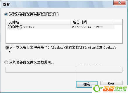 效能日記本提供備份功能,支持用戶備份已經創(chuàng)建的日記本數(shù)據(jù)。程序的默認備份目錄是“我的文檔/EfficientPIM Backup”。用戶可以將其轉移至其他硬盤分區(qū)或者直接拷貝在U盤中遷移到其他電腦上。效能日記本備份文件的擴展名為.edfbak。