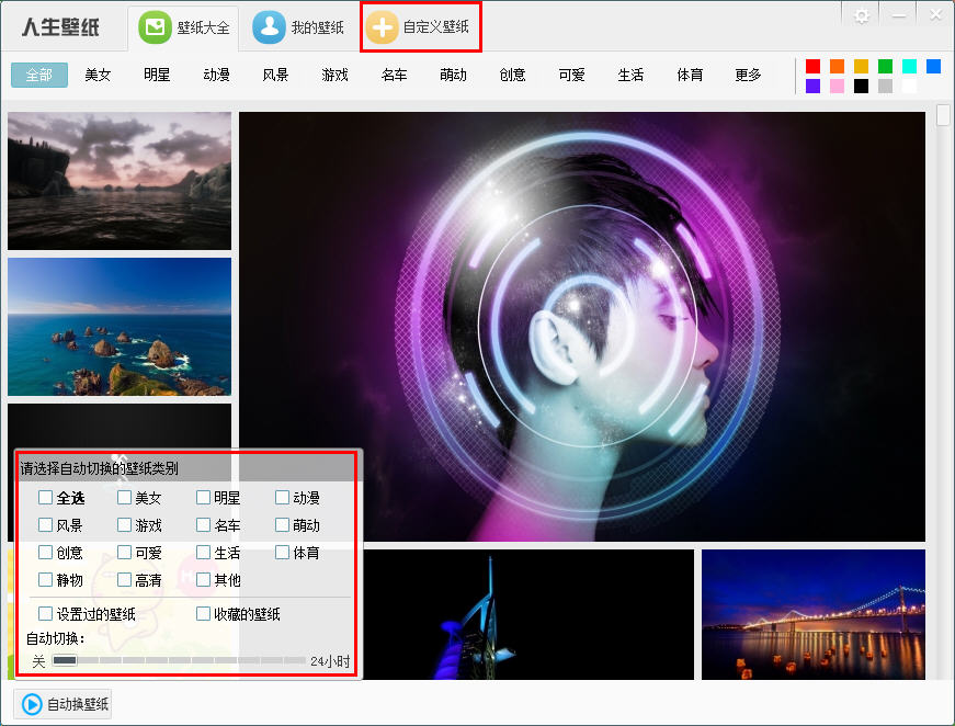 你還可以自定義設置桌面壁紙。點擊左下角自動換壁紙,就可以自定義選擇壁紙類別,并且選擇自動切換的時間,那么在你自己不操作的情況下,就可以隨時隨心切換壁紙。如果你喜歡用自己拍的照片設置成桌面壁紙,你也可以點擊自定義壁紙,添加電腦本地的照片來設置壁紙。人生壁紙會給你私人定制般的待遇。