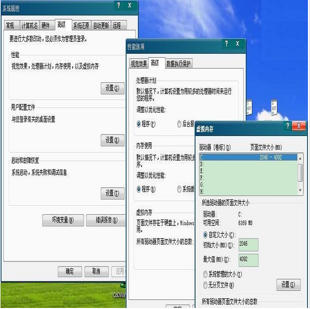 右鍵點擊“我的電腦”、“屬性”、“高級”,點擊“性能”區域中的“設置”按鈕,出現“性能選項”窗口,點擊“高級”標簽,下面的虛擬內存區域中點擊“更改”按鈕,即可進行重新設置。