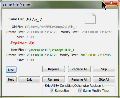 只能在復制過程中彈出操作提示框,雖然非常清晰地顯示出 源文件夾 與 目標文件夾中沖突文件的創建時間,文件名以及具體位置,但是提供的選項過于單一,與系統自帶的復制軟件相比較,沒有特別大的優勢,更不需說和以上三款軟件相比了呢。