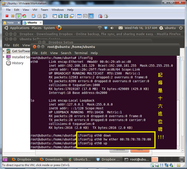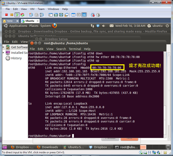 2. 由于Dropbox在Linux Distribution下,辨認是否為同一個人(PC),是用Mac address來辨認,所以就是在這邊動手腳。