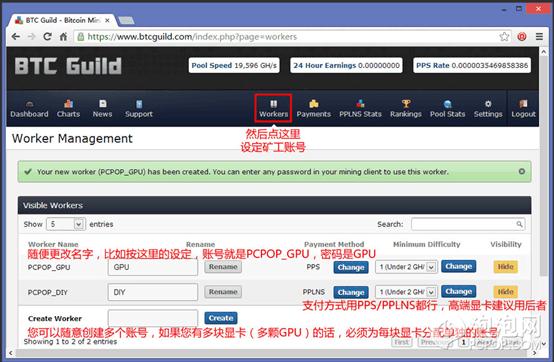 然后就是最重要的礦工賬號設置了,礦工顯然指的就是CPU或者GPU,您需要為每一個CPU或GPU設定一個賬號,假設您有兩塊HD7990,就需要為4顆GPU設定4個不同的賬號