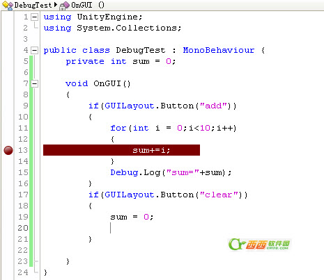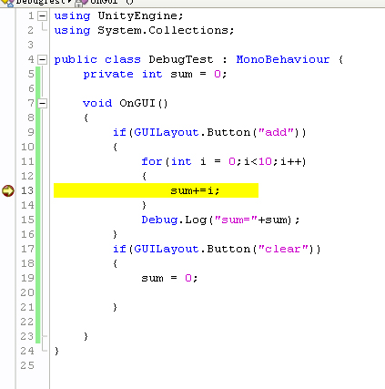 然后回到Unity里面,點擊第一個按鈕“add”。這時候斷點起作用了,程序會暫停,MonoDevelop跳到斷點的行。