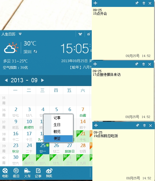 同時新增桌面便簽記事功能,方便用戶記錄當日所需完成工作,并可任意鎖定在電腦桌面任意一個位置;對于工作較為繁瑣的白領們來說,是一個很強大的功能,把當天功能用人生日歷便簽記錄下來并鎖定在電腦桌面上,完成一件可以關閉一個便簽或者在便簽里刪除已完成事項;這樣一來再繁瑣的工作也不擔心會忘記了!