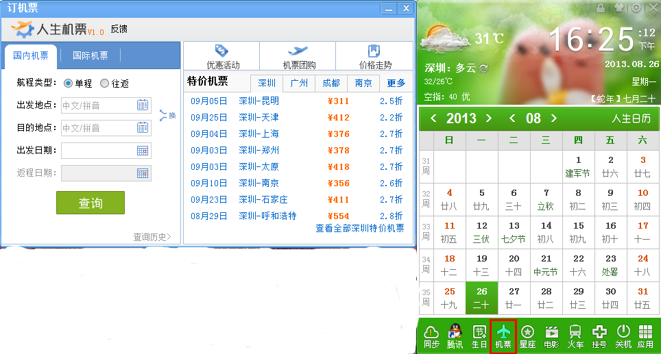 用日歷訂機票,您也可以潮一把了!人生日歷不僅可以訂火車票,而且還可以訂機票,無論您需要的是單程,往返,特價機票,還是其他機票優(yōu)惠活動,都可以在人生機票里面搜索到。如果您需要經(jīng)常預訂機票,那么也可以將機票小插件添加到人生日歷的主頁面,當您下次想要預訂機票的時候,在電腦桌面上就可以直接進行搜索。