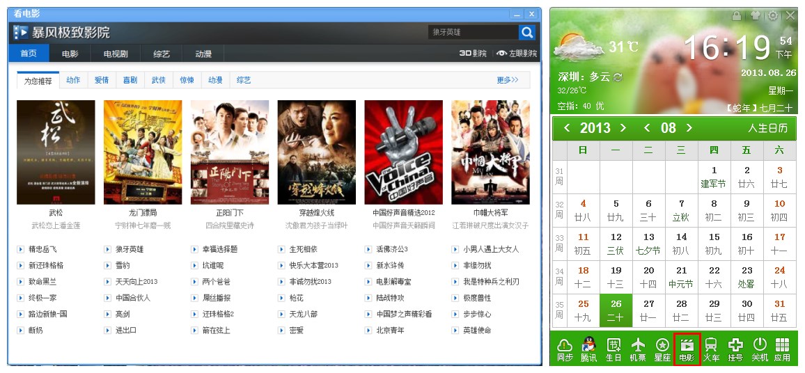 用日歷看電影,您一定沒有體驗過吧?人生日歷最近新增看電影小插件,我們都不需要安裝任何其他視頻軟件,只要點擊這個按鈕,就可以看到最近熱播的電視電影了。如果您覺得老打開應用插件管理很麻煩,還可以直接將看電影插件拖動到主面板上的應用欄,就可以在人生日歷的主頁面上看到電影小插件,然后您每次打開電腦看到人生日歷,想看什么電視電影,只需輕松一點,就可以馬上獲取,減少了您等待、搜索的時間。