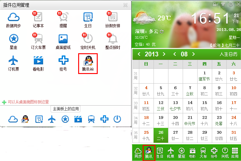 人生日歷還有一個很便捷的功能。人生日歷應用插件管理也可以將桌面上的圖標直接拖進去進行管理,例如,我們可以將QQ圖標拖到人生日歷應用插件頁面,然后再將QQ圖標拖到人生日歷的主頁面,這樣在人生日歷的主頁面就可以添加QQ圖標了。以后在人生日歷的主頁面就可以快速登錄QQ。我們可以把自己喜歡的軟件圖標拖動到人生日歷的主頁面,這樣就不需要再在一堆桌面快捷方式里“艱難”的尋找自己心愛的軟件了。