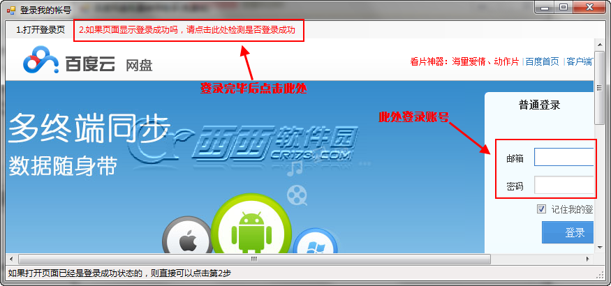 2、進入軟件后我們要先登錄自己的百度網盤賬號,這里按照軟件的提示操作,點擊軟件界面的登錄我的百度網盤賬號會彈出登錄界面,登錄完畢后點擊頁面上方的第二步,如果成功該頁面會關閉。