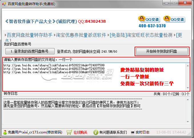 這款百度網盤批量轉存助手是智者軟件旗下一款軟件,免費版的一次只能轉存三個鏈接,想要無限制的只能去購買了,不過三個也比一個個點擊要好多了。