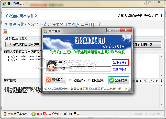 1、打開軟件后會出現登錄界面,初次使用點擊免費注冊來申請一個賬號,注意申請的時候要求填寫郵箱,而殺軟可能會提醒有程序試圖獲取郵箱地址,這里選擇允許就可以了。