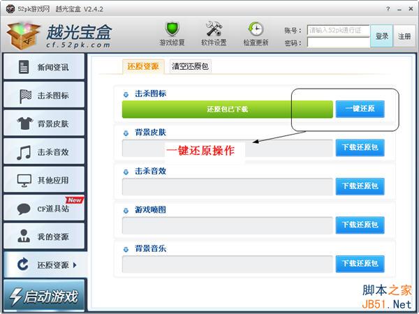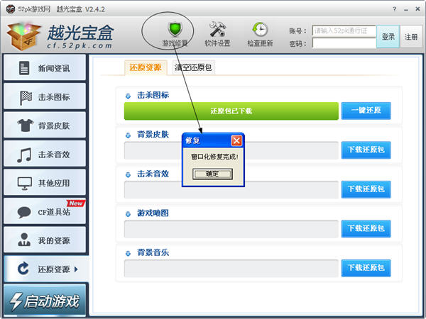 現在很多小朋友喜歡把游戲窗口化來玩,估計是為了聊QQ方便吧,不用彈出游戲。但是小朋友們卻不知道怎么還原游戲,去掉游戲窗口化。那么大家只需要下個CF越光寶盒點擊游戲修復即可!