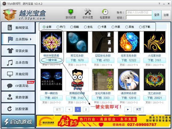 大家可以擊殺圖標,在右邊選擇你想要的圖標下載,然后一鍵安裝, 啟動游戲即可!
