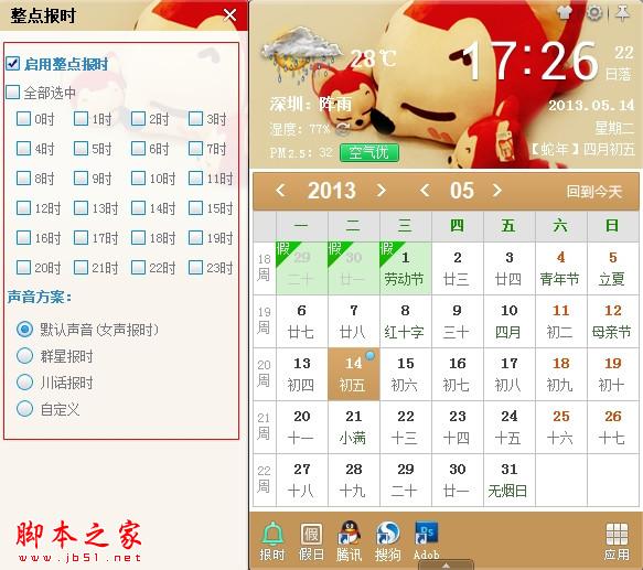 美女播音整點報時?對,你沒聽錯,哪天你突然聽見美女整點為您報時,絕對不是幻聽;人生日歷整點報時功能,采用美女主播聲音報時,夠吸引你了吧?另外還有群星報時、川話報時等各種版本。假如說,你想自定義。沒問題,絕對滿足您自定義整點報時聲音的要求,只需勾選自定義,便可自主上傳報時鈴聲。這下你還擔心報時聲音不喜歡嗎?