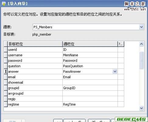 導入類型選擇access mdb,選擇風訊的mdb,選擇會員數據表fs_members目標表dedeCMS的會員表:dedecms_member,下一步
