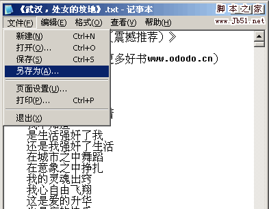 2、一般情況下,這種txt格式文件都是以ANSI編碼存檔,這是默認編碼。但是JAR格式電子書需要Unicode編碼的TXT文件,我們可以用另存為的方式將ANSI編碼txt格式文件,轉換成Unicode編碼TXT文件。因此,我們先打開你要制作的TXT格式書籍,選擇“文件”“另存為”,如圖: