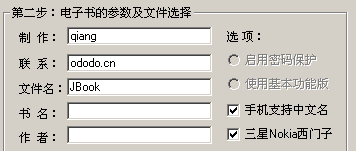 4、設置你所將要制作的電子書的各項屬性,制作——即可填寫你自己的ID、聯系——可填寫你的郵箱地址或者主頁地址、文件名——為你所制作出的電子書的名稱(可為中文,但是需要你的手機能夠識別,個人建議使用英文比較適合所有手機)、書名作者——這兩項根據你的需要填寫(最好為英文字母,若是中文可能因為你的手機的特殊原因導致在手機中無法讀取)、手機支持中文名和三星nokia西門子——這個選項最好全部勾選。以上內容基本為自定義內容,你可以根據自己的需求隨意填寫。如圖: