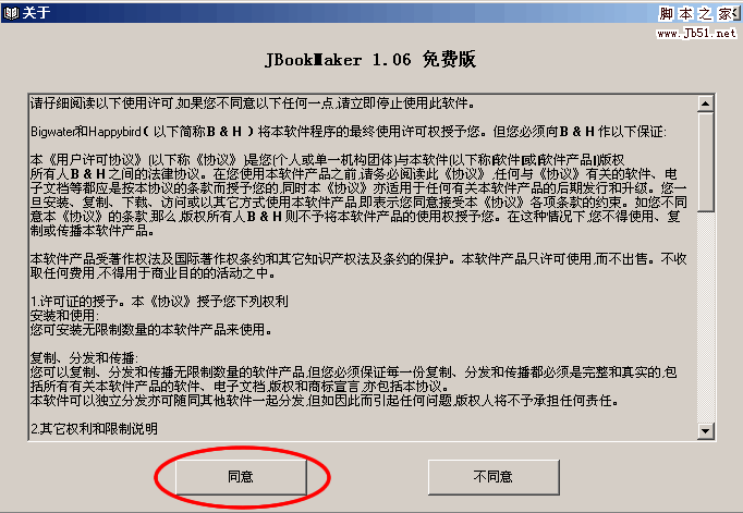 1、雙擊你剛才下載的JBookMaker.exe軟件,得到一個免費使用的提示畫面,同意即可,如果你想使用該軟件更多功能,就需要去注冊,個人覺得免費版本已經夠用,如圖: