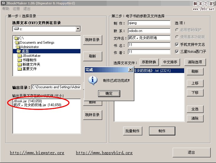 說明:這是一個類似于白癡的教程,也就是說,即使你完全是個電腦盲,只要你想做JAR格式電子書,你按照這個上面的來,肯定是可以做成功的。如果你是高手,那自然不必我說,其中要注意的兩點,1、制作材料——也就是原始的TXT格式電子書必須是Unicode編碼;2、你所制作的電子書的書名和作者名最好是英文字母。這兩點是比較容易導致你制作成功,拷貝到手機里,卻無法閱讀的原因。