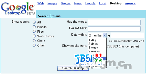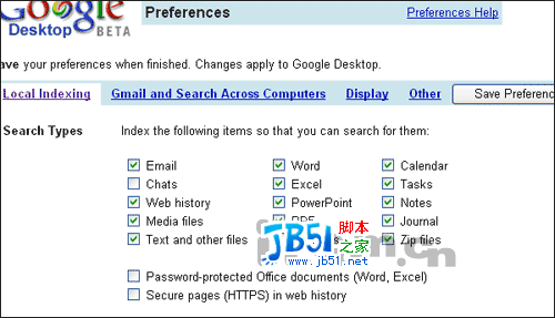 在“Desktop Preferences(偏好設(shè)置)”中,點擊“Gmail and Search Across Computers”鏈接,在這里可以設(shè)置是否搜索GMAIL和遠(yuǎn)程桌面搜索。