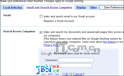 在“Search Across Computers”后勾選“Index and search my documents and viewed web pages from across all my computers.”即可進行遠(yuǎn)程桌面搜索,需要注意的是:使用該功能必須需要你擁有Google Account(GOOGLE帳戶 ),你可以使用GMAIL帳戶,也可以重新注冊google帳戶。