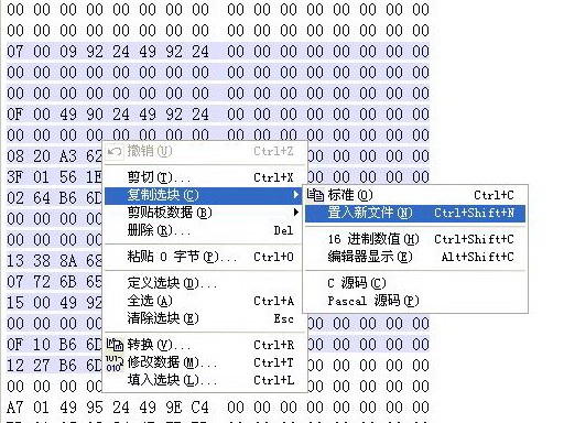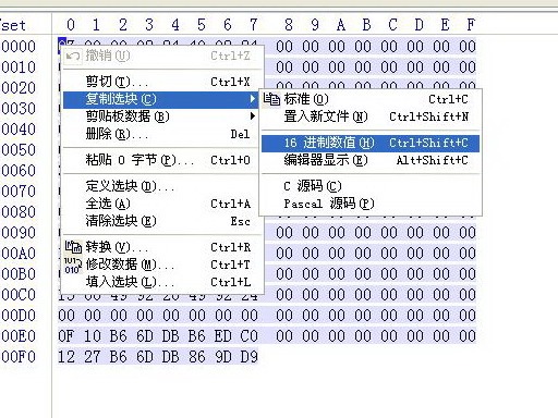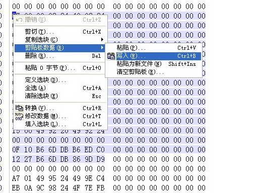 導入:把備份數據定義選位,(如果是全文件那就直接Ctrl+A),然后右鍵右擊,選擇“編輯——復制區塊——十六進制數值”;再定位到要還原的數據的首地址,右鍵點擊,選擇“編輯——剪貼版數據——寫入”即可。注意是“寫入”不是“粘貼”。