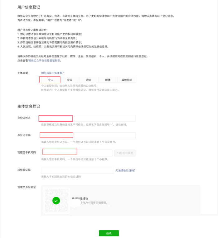 點擊郵箱中的激活鏈接后,進入到填寫小程序的主體信息頁面。選擇主體類型為【個人】,填寫真實身份證姓名、身份證號碼,管理員手機號,發送驗證碼,并綁定管理員微信,使用微信掃描二維碼。注意:一個身份證只能注冊5個公眾號,信息填寫完畢后點擊繼續。