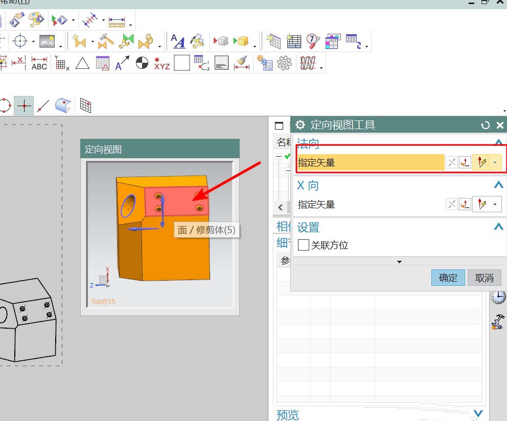 4、打開定向視圖工具后,讓法向矢量為自動判斷,鼠標點選要定向的面;可以按中鍵擺好模型的方向,按F8擺正模型。即可得所要視圖。
