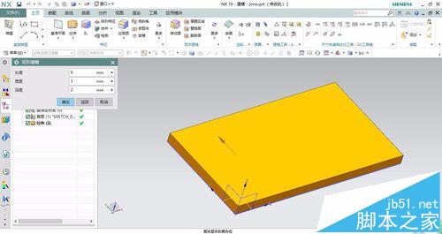 8、輸入長(zhǎng)度深度寬度參數(shù),輸入名稱(chēng),效果圖如下圖所示,完成矩形槽的建立。