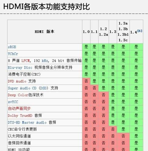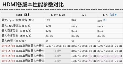 HDMI接口的優勢HDMI不僅可以滿足1080P的分辨率,還能支持DVD Audio等數字音頻格式,支持八聲道96kHz或立體聲192kHz數碼音頻傳送。 HDMI支持EDID、DDC2B,因此具有HDMI的設備具有“即插即用”的特點,信號源和顯示設備之間會自動進行“協商”,自動選擇最合適的視頻/音頻格式。 與DVI相比HDMI接口的體積更小,DVI的線纜長度不能超過8米,否則將影響畫面質量,而HDMI最遠可傳輸15米。只要一條HDMI纜線,就可以取代最多13條模擬傳輸線,能有效解決家庭娛樂系統背后連線雜亂糾結的問題。以下是HDMI的接口參數及個版本功能的對比,如圖所示: