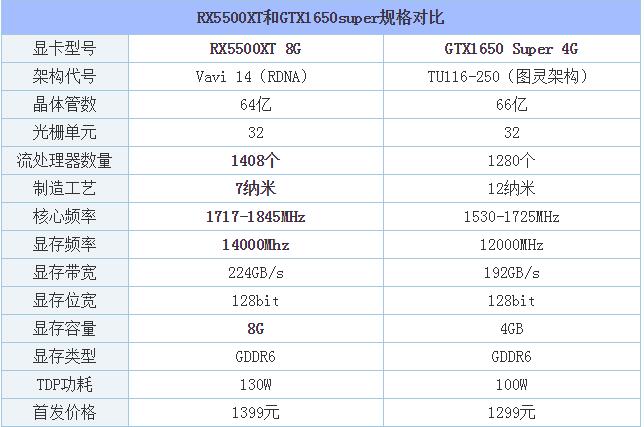 RX5500XT和GTX1650super哪款好?在2019年11月22日,NVIDIA搶先發(fā)布了GTX1650Super,采用了全新的TU116核心,搭載了全新的GDDR6顯存,相比GTX1650綜合性能提升了30%左右,首發(fā)價(jià)格為1299元。而AMD在本月也推出了RX5500XT,填補(bǔ)新顯卡千元級價(jià)位的空擋,其首發(fā)價(jià)格為1399元。那么RX5500XT和GTX1650super哪個(gè)好?感興趣的朋友快來了解一下吧。