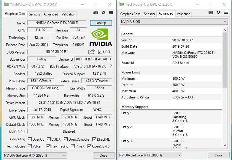 以上為GPU-Z的截圖,影馳RTX 2080 Ti HOF十周年紀念版擁有4352個流處理器,基礎頻率1350MHz,加速頻率高達 1740MHz,比公版高了105MHz。另外顯存用的是三星GDDR6顆粒,可以非常輕易的超頻到16000MHz以上的頻率。TDP則高達300W,可以釋放RTX 2080 Ti HOF十周年紀念版的全部性能。