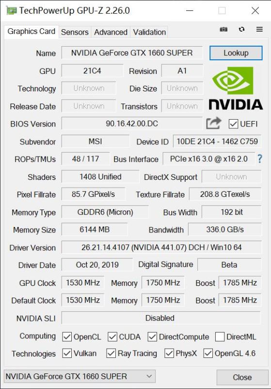 GTX 1660 Super使用的還是TU116-300核心,同樣的1408組CUDA核心,基礎頻率和Boost頻率也是和GTX 1660一樣。顯存和之前的小道消息一樣,升級倒了DDR6,這么一來顯存的帶寬提高到了336GB/s,甚至超過了GTX 1660Ti的288GB/s。