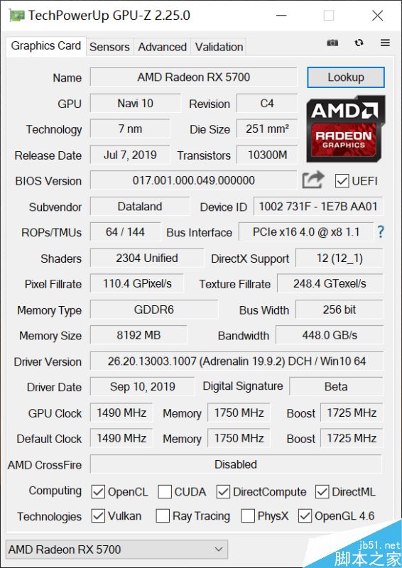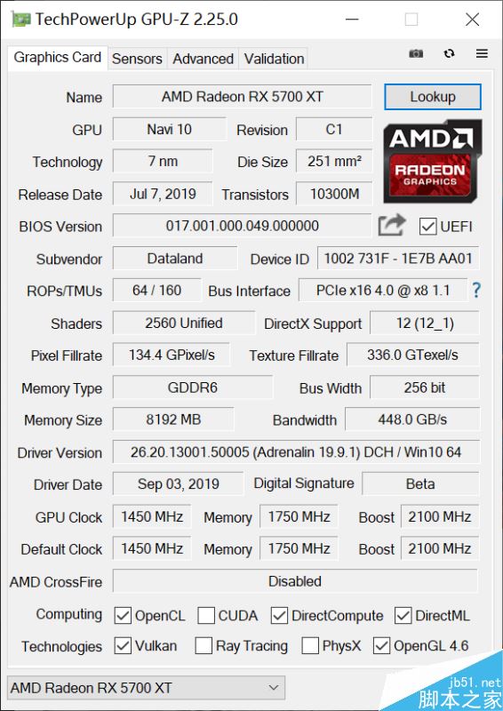 AMD這代卡和以往不同,雖然迪蘭官方標的頻率基本和公版差不多,但是我們可以看到在GPU-Z中,5700XT戰將的BOOST頻率能夠達到2100MHz。這點和英偉達的GPU BOOST 4.0技術有著異曲同工之妙,實際頻率要看顯卡本身的散熱水平和體質。