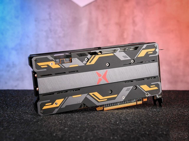 再來看顯卡背面,顯卡背面的背板設計也十分漂亮,整體金屬背板與正面采用相同的黑、灰、橙三色,讓整體電競感再一次提升。背板中部一條貫穿整個背板的拉絲灰造型,金屬質感出眾。背板中央有點綴一個紅色的“X”logo表明身份。而背板的好處不用多說,在增強顯卡整體強度的同時還能輔助散熱,一舉兩得。