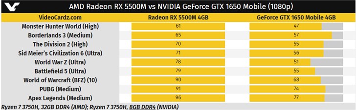 移動(dòng)端的RX 5500M同樣是領(lǐng)先GTX 1650,《絕地求生》中畫質(zhì)下可達(dá)91幀,而GTX 1650移動(dòng)版為74幀。
