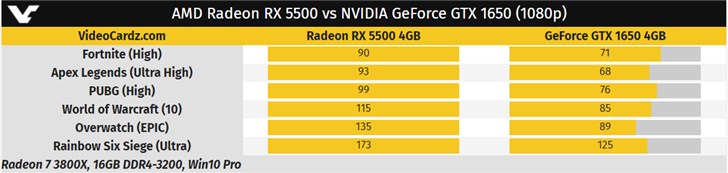 在電子競技類游戲中,RX 5500同樣明顯領(lǐng)先GTX 1650,在《絕地求生》中,RX 5500在高畫質(zhì)下可以達(dá)到99幀,而GTX 1650為76幀。