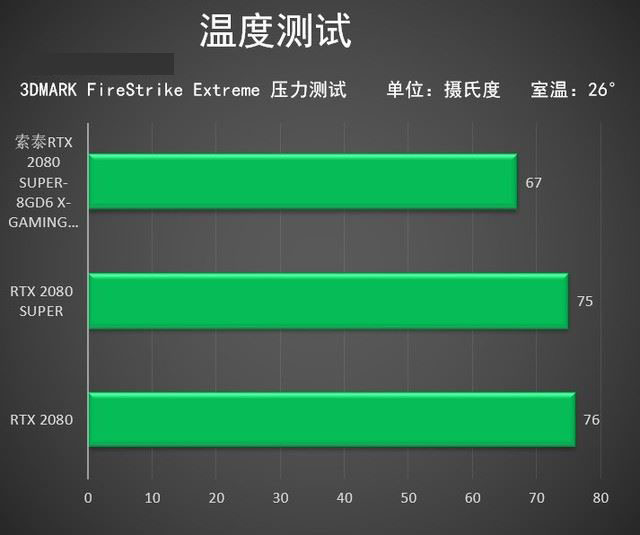 在溫度方面,經過FSE壓力測試的軟件檢測,索泰RTX 2080 SUPER-8GD6 X-GAMING OC的最高溫度為67°,低于公版RTX 2080 SUPER °,低于公版RTX 2080 °。而67°的成績在RTX 2080 SUPER系列來說是一個非常優秀的溫度。