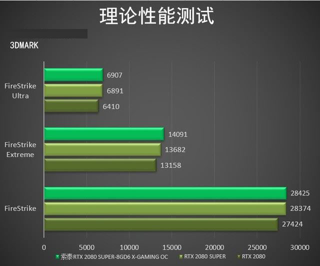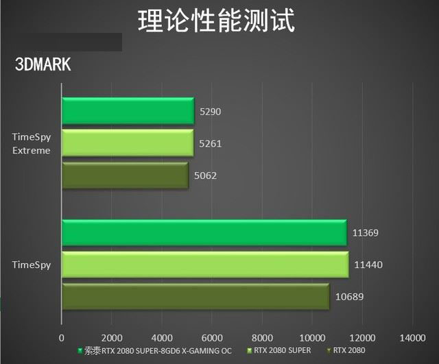 在理論性能測試中,索泰RTX 2080 SUPER-8GD6 X-GAMING OC的表現略好與公版RTX 2080 SUPER,而比起公版RTX 2080提升則較大。