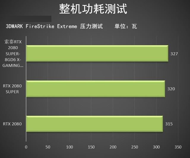 如圖所示,索泰RTX 2080 SUPER-8GD6 X-GAMING OC的整機平臺功耗為327W,較公版RTX 2080 SUPER的整機平臺功耗高7W,相較公版RTX 2080整機平臺功耗高12W。就目前來說,這個功耗在高端顯卡是可以接受的。而索泰RTX 2080 SUPER-8GD6 X-GAMING OC的官方建議搭配650W電源。
