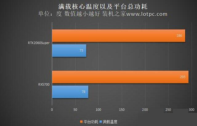 而RX5700滿載核心溫度為78度,平臺總功耗為293W,而RTX2060Super滿載核心溫度為73度,平臺總功耗為286W,其實這項測試已經在意料之內了,溫度控制與功耗這方面,畢竟NVIDIA一直占據較大優勢。不過測試的RX5700目前是公版,散熱比較差,等待非公版推出可能溫度會相對好一些。