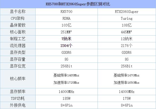 我們先來看看,RX5700與RTX2060Super的參數規格對比,更好的直觀看出兩者參數的對比,如下所示。