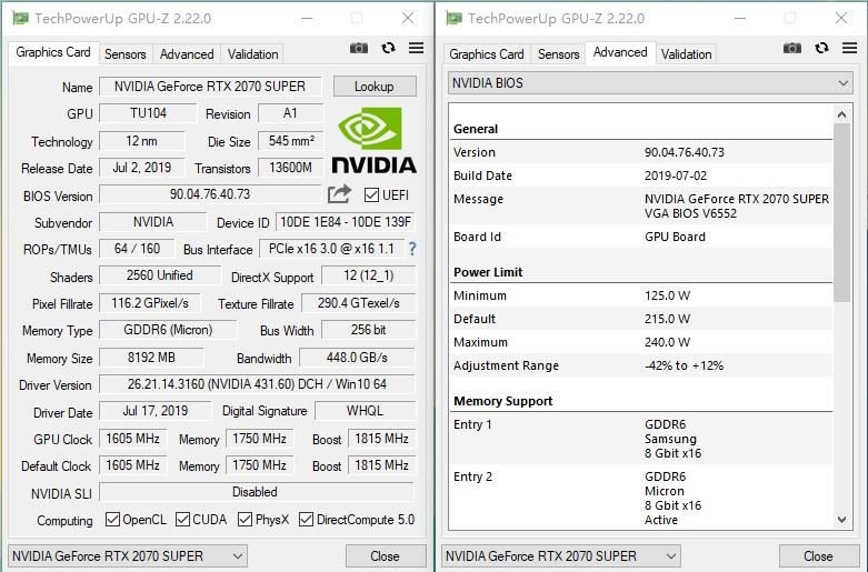 GPU-Z的截圖。耕升RTX 2070 Super炫光OC擁有2560個流處理器,64個ROP單元和160個紋理單元,顯存容量8GB,顯存頻率14GHz,帶寬448GB/s,TDP 215W,以上這些與公版都毫無二致。